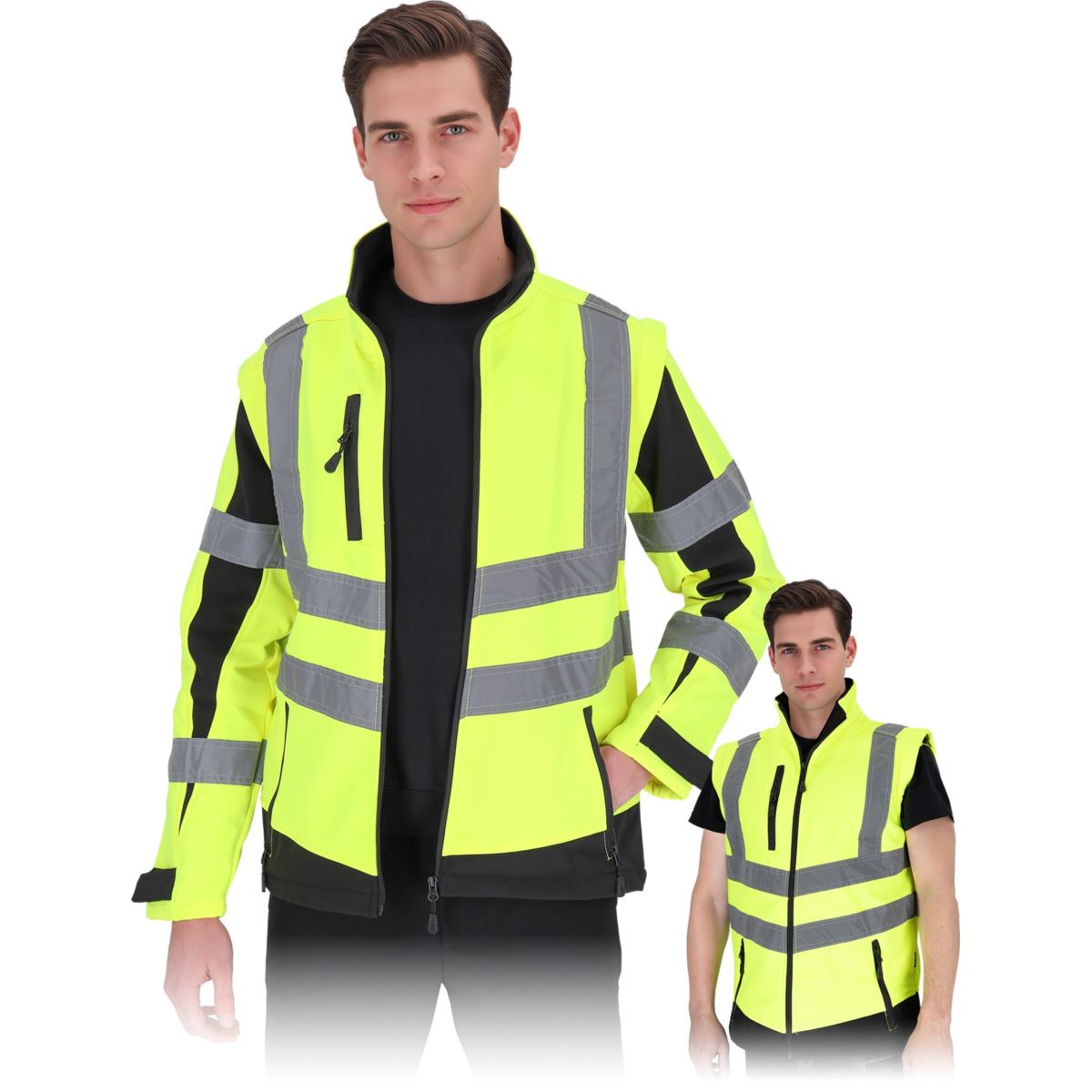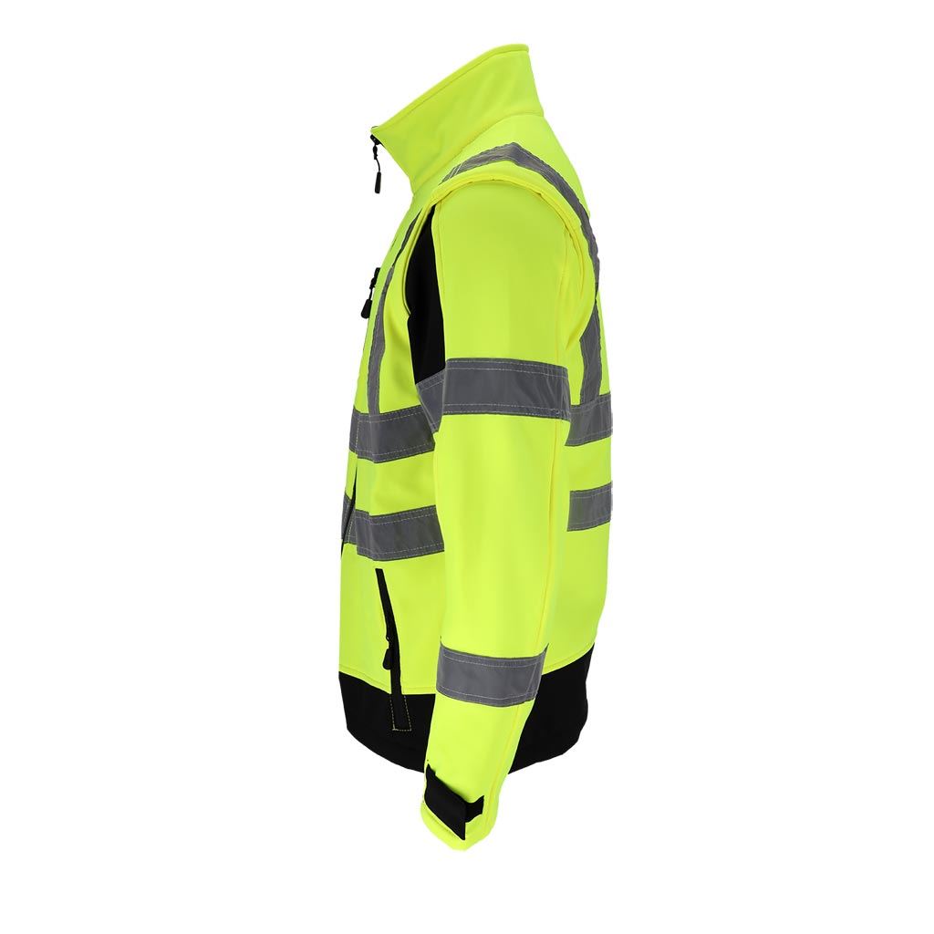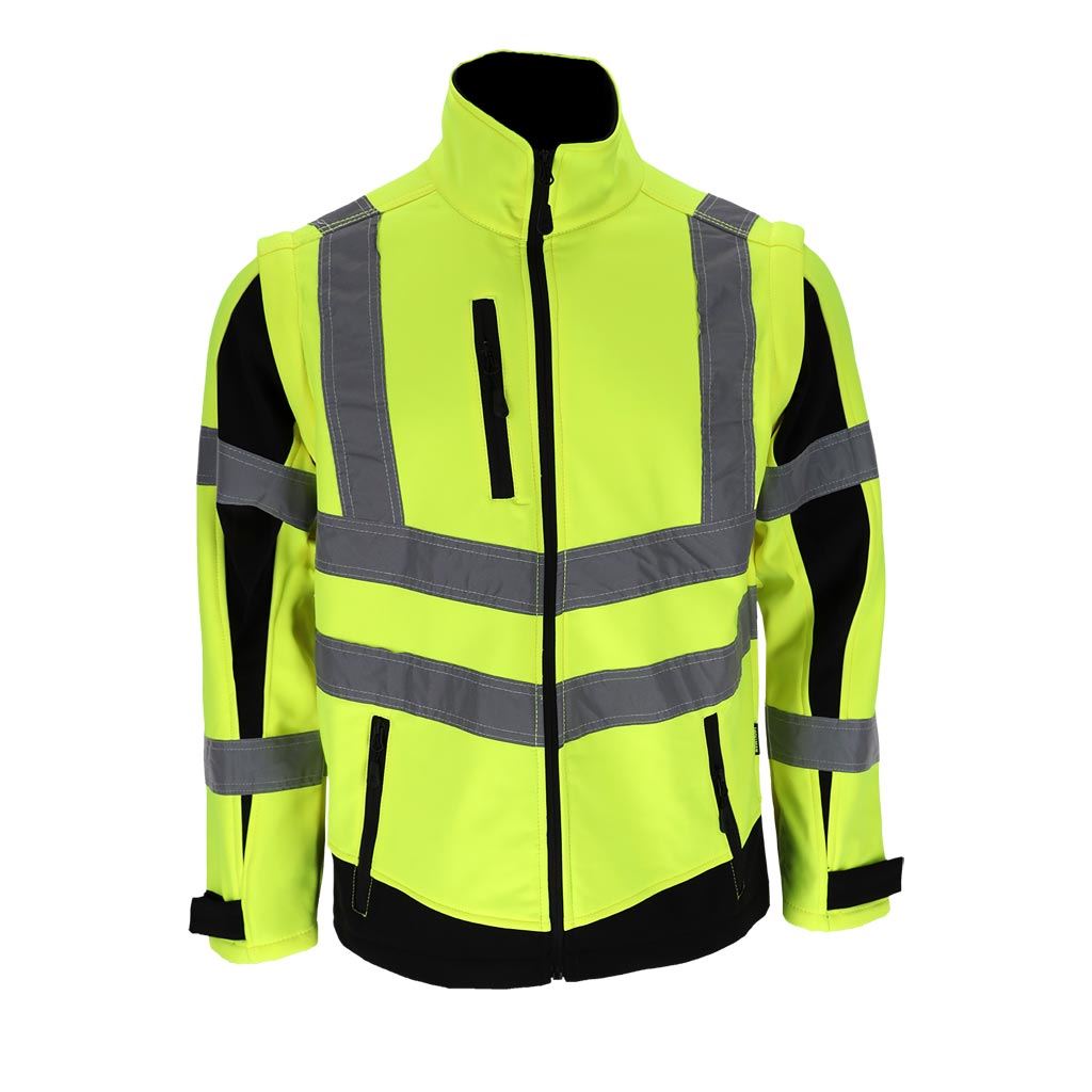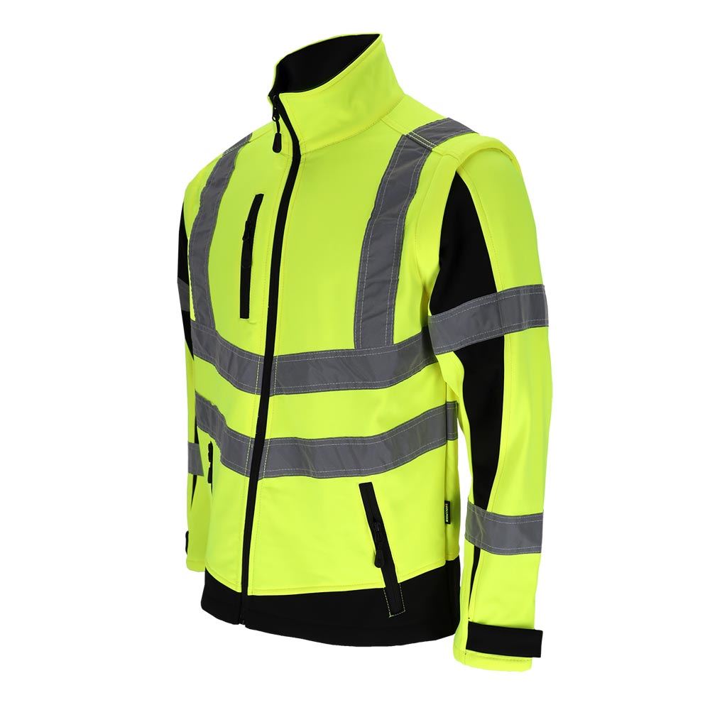 Model wyposażony jest w odpinane rękawy, dzięki czemu kurtkę można łatwo przekształcić w kamizelkę roboczą. Fluorescencyjna tkanina oraz segmentowe pasy odblaskowe zwiększają widoczność użytkownika, co jest szczególnie istotne podczas pracy przy drogach lub w warunkach ograniczonej widoczności.