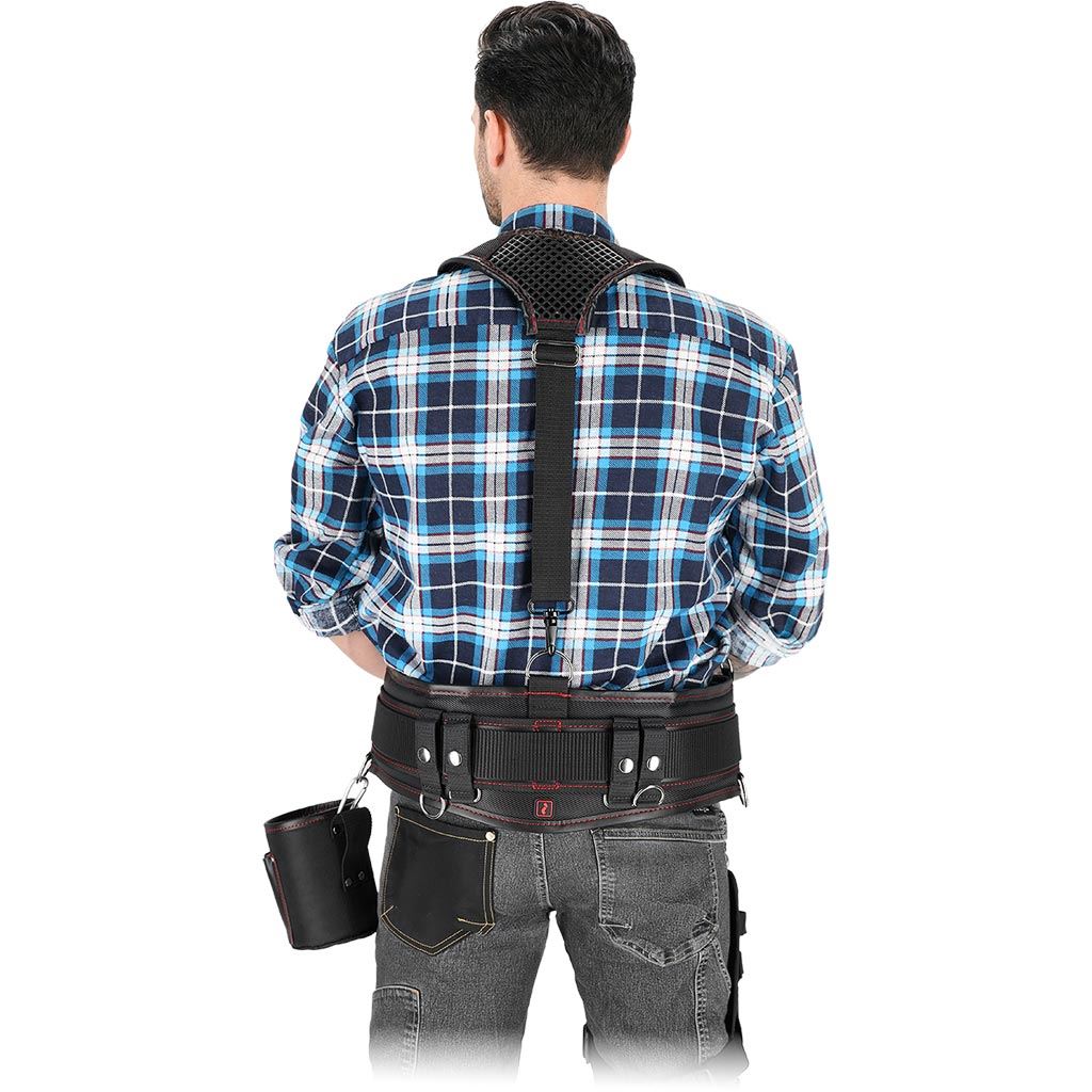 Specjalne nakropienie PVC po wewnętrznej stronie stabilizuje szelki na plecach i zapobiega ich przesuwaniu się podczas pracy. Regulowana długość taśmy tylnej (ok. 26–50 cm) oraz taśm przednich (ok. 24–46 cm) umożliwia precyzyjne dopasowanie do sylwetki. Model zapinany jest na wytrzymałą klamrę z polioksymetylenu (POM) i mocowany do pasa za pomocą karabińczyków. Dodatkowe końcówki pozwalają na przypięcie narzędzi.